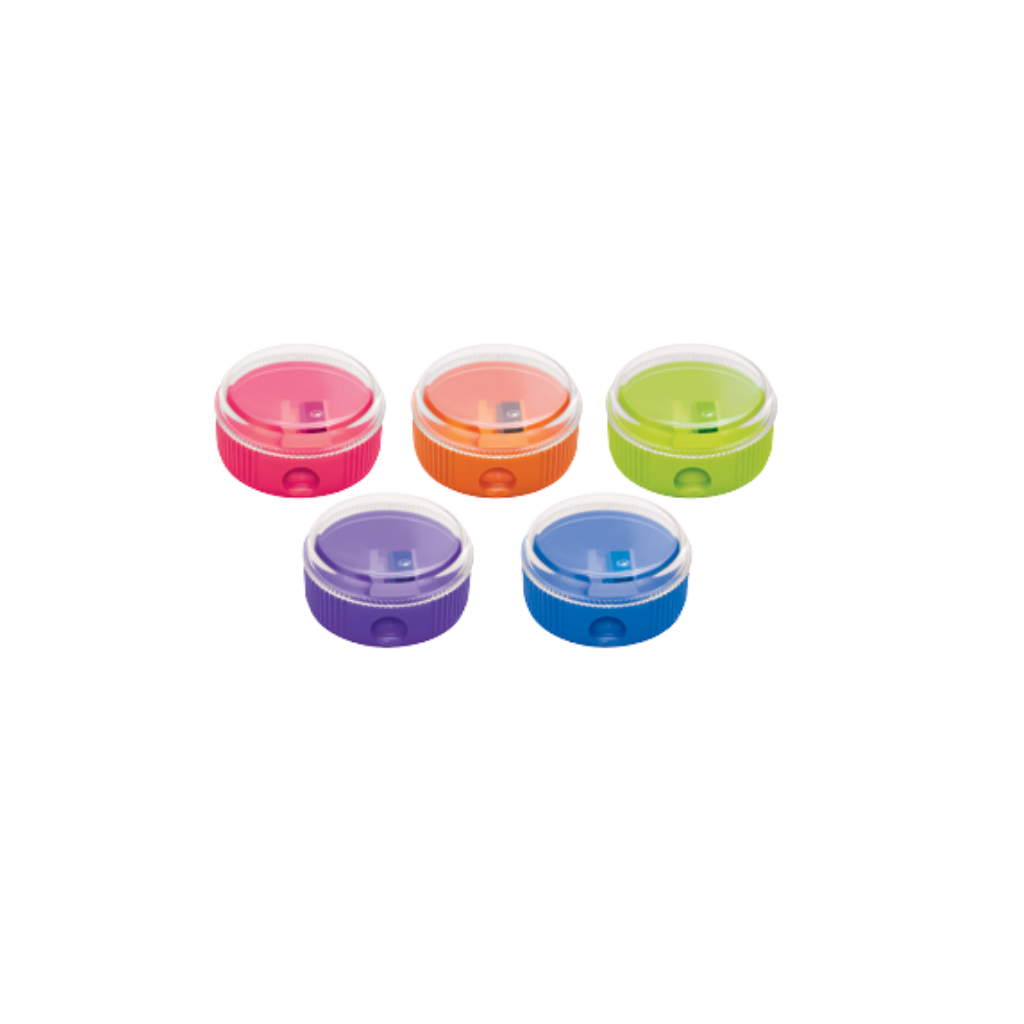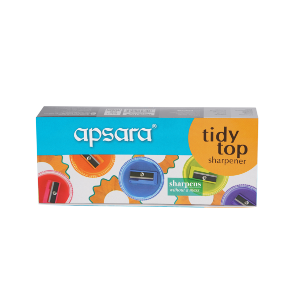 The tidy top sharperner is designed to prevent mess while sharpening, with a built-in container to catch shavings. It features an easy-to-grip design for comfortable use and is compact enough to fit conveniently in pencil boxes. Easy to sharpen, rust-free, and effective at preventing mess, this sharpener combines practicality with convenience for everyday use